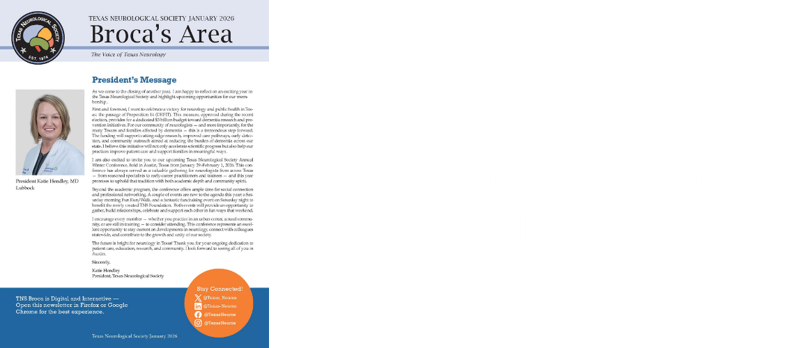 The Texas Neurological Society is the nation's largest state neurological society with over 900 members. Join our community to advance the field of neurology and advocate on behalf of our patients and practice.